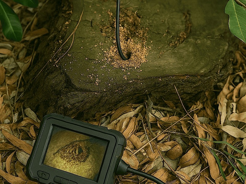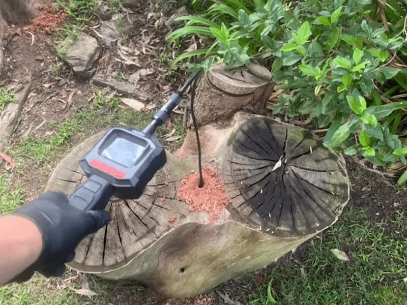 Termite nests often form inside trees and stumps, creating a hidden risk for nearby buildings. As part of our inspection process, we can drill into the trunk to test for hollow areas where a nest may be present. Using a borescope camera or temperature probe, our technicians can confirm active termite activity inside the tree. If a nest is detected, targeted chemical treatment can be applied directly into the hollow, eliminating the colony at its source and reducing the threat to your Northern Beaches property.